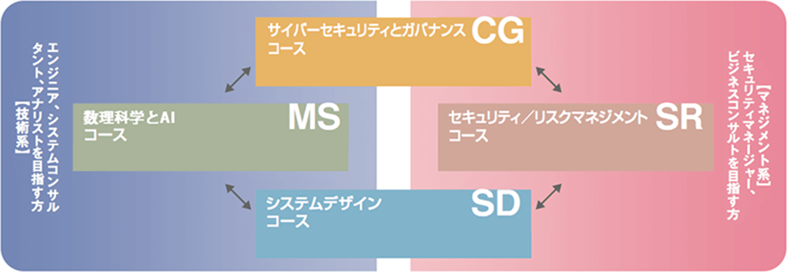 情報セキュリティ分野に欠かせない技術系とマネジメント系の専門性を融合させた総合力を身につけるカリキュラムを編成しています。