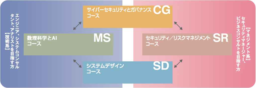 情報セキュリティ研究科博士前期課程では、高度化・複雑化する企業・官公庁等の現場ニーズを踏まえ、技術系・マネジメント系とも幅広い人材育成需要、教育需要に応えるため、4つのコースフレームを設定しています。なお、指導教員の履修指導のもと、他のコースが推奨する科目も自由に履修することができます。